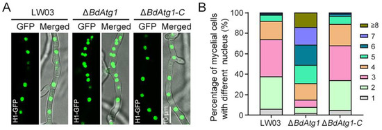 Autophagy has been reported to contribute to the regulation of nuclear dynamics in the filamentous fungus Fusarium oxysporum [21]. To test the effect of BdAtg1 on nuclear dynamic in B. dothidea, the nuclei in mycelial compartments of each strain was observed. As shown in Figure 7, the number of nuclei per mycelial compartment in LW03 and ΔBdAtg1-C was mostly 2 to 4, while the number of nuclei in ΔBdAtg1 was mostly 4 to 8. These results indicate that BdAtg1 regulates nuclear dynamics in B. dothidea.