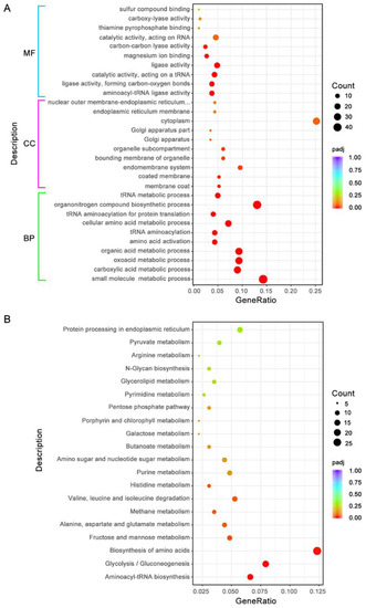 Because of the number of severe phenotypic changes, we performed a transcriptome sequencing of LW03 and ΔBdAtg1 during the mycelial growth stage. Compared with LW03, a total of 760 differentially expressed genes (DEGs) were identified in ΔBdAtg1, including 561 and 199 upregulated and downregulated genes, respectively (Figure S2). Gene Ontology (GO) and KEGG enrichment analysis revealed that inactivation of BdAtg1 significantly affected multiple metabolic pathways in B. dothidea (Figure 8). These results suggest that BdAtg1 regulates multiple metabolic pathways in B. dothidea.