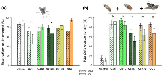 Susceptibility of Delia radicum (CRF) to isolates of M. brunneum in two different substrates (sterile sand = light grey bars; non-sterile soil substrate = dark grey bars). (a) Percentage of emerged CRF adults and (b) total mortality (larvae, pupae, and adult flies). The insects were exposed as larvae (L3) to substrate treated with fungal spores. Asterisks denote a significant difference from the control according to GLM, binomial distribution (p < 0.05) (Significance: ** p ≤ 0.01; * p ≤ 0.05). Mortality caused by the isolates with different letters in (b) differ significantly from each other (Tukey HSD test, p < 0.05). Data represent means ± SE; n = 12.