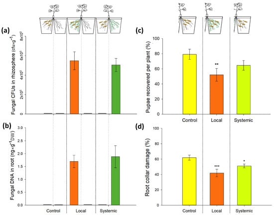 Local colonization of rhizosphere and plant roots by M. brunneum Gd12 and local and systemic effects on CRF survival and root damage. (a) Fungal colonization of rhizospheric soil (CFU g−1); (b) fungal DNA in root collar tissue (ng × g−1 DW); (c) CRF pupae recovered; (d) root collar surface damage (%). Four eggs of CRF were placed on the root collar of 6-week-old plants in a split-root setup that had been inoculated with M. brunneum Gd12 either in the local or systemic compartment by root drenching at transplanting time (10 days after sowing). Asterisks above bars indicate significant differences from the control according to binomial GLM (c) or according to percentage Beta-regression analysis (d), (p < 0.05), (Significance: *** p ≤ 0.001; ** p ≤ 0.01; * p ≤ 0.05). Data represent means ± SE; n = 12.
