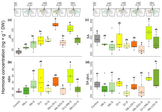 Phytohormone concentration of (a) jasmonic acid (JA), (b) abscisic acid (ABA), (c) salicylic acid (SA) and (d) salicylic acid glucoside (SA glu) in the tap roots of B. napus in a split-root setup. Local and systemic roots received the following treatments: mock inoculation with Tween 0.01% (control), Metarhizium brunneum in the local (Mb-L) or systemic (Mb-S) roots, CRF egg infestation in the local (Dr-L) or systemic (Dr-S) roots, both treatments in same roots (Mb-L/Dr-L), or different treatments on each split-root system (Dr-L/Mb-S; Mb-L/Dr-S). Plants were inoculated with M. brunneum at transplanting (10 d) and were harvested 7 days after egg infestation, 5 weeks after Mb inoculation. Different letters indicate statistically significant differences based on a linear model, and Tukey’s post-hoc test. Boxplots show the distribution of the data, where the lower, middle, and upper lines represent the first quartile, the median, and third quartile, respectively. Data points represent independent biological replicates (n ≤ 6).