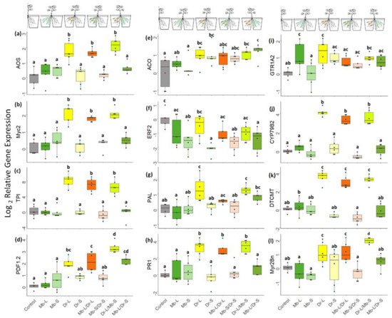Expression of genes involved in defense signaling in taproots of B. napus in response to CRF herbivory or/and M. brunneum inoculation. Left panel shows genes related to jasmonic acid signaling (a–d). Central panel depicts genes involved in ethylene (e,f) and salicylic acid (g,h) signaling. The right panel shows genes involved in glucosinolate-related defense (i–l). The plants grew in a split-root setup in which each compartment had M. brunneum inoculation (Mb) in the local (L) or adjacent (S) compartment, CRF egg infestation (Dr) in the local (L) or adjacent (S) compartment, both treatments in the same compartment (Mb-L/Dr-L), or each in adjacent compartments of the same plant (Dr-L/Mb-S; Mb-L/Dr-S). Eggs were added 4 weeks after Mb inoculation. Plants were harvested 7 days after egg infestation. The letters represent statistically significant differences in the expression of the control treatment (Tukey HSD, p < 0.05). Boxplots show the distribution of the data, where the lower, middle, and upper lines represent the first quartile, the median, and third quartile, respectively. Data points represent independent biological replicates (n ≤ 6).