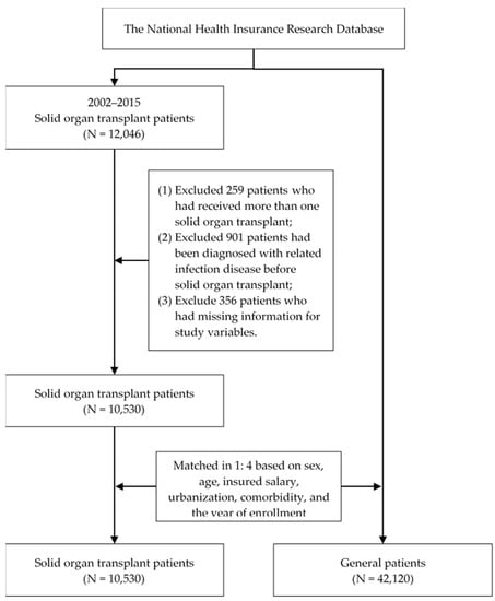Patients who received SOT between 2002 and 2015 were enrolled in the study, including those who underwent renal (ICD-9-CM V42.0), liver (ICD-9-CM V42.7), heart (ICD-9-CM V37.51), or lung (ICD-9-CM V42.6) transplant. Patients who had received more than one SOT, had received a diagnosis of related infectious disease before SOT (e.g., PJP, cytomegalovirus disease, and herpes simplex virus), or for whom there was insufficient information regarding the study variables were excluded. Propensity score matching (PSM) was used to obtain 1:4 matching for each patient receiving SOT. The characteristics selected for PSM were sex, age, insured salary, urbanization of residence, Charlson comorbidity index (CCI), and year of inclusion in the study.