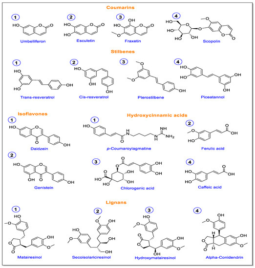 Lignans are vital physiological, developmental, and ecological plant metabolites. They are formed by coupling reactions of monolignols and defend against herbivores and pathogens [122]. Plants’ dirigent protein crucially regulates the initial coupling reactions that form lignans. PINORESINOL-LARICIRESINOL REDUCTASES (PLR) then encode successive reduction reactions to form lariciresinol and secoisolariciresinol from pinoresinol. A soybean dirigent protein (GmDIR22) was identified to regulate coniferyl alcohol coupling into lignan (+)-pinoresinol to restrict P. sojae hyphal growth. An enhanced concentration of yatein was detected in the roots and leaves of mycorrhizal plants in conferring resistance against B. cinerea infections [123]. The chemical structures of lignin pathway-associated phytoalexins shown in Figure 3.