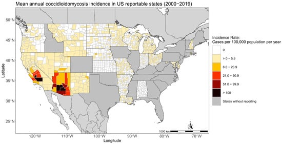 - Centers for Disease Control and Prevention. Valley Fever Maps. 2020. Available online: https://www.cdc.gov/fungal/diseases/coccidioidomycosis/maps.html (accessed on 1 December 2022).