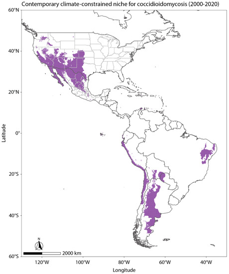 Outside the US, there is less knowledge on the endemic area for coccidioidomycosis, but understanding the environmental controls on US disease cases may provide insight for future studies. We used the methods developed in Gorris et al. (2019) to estimate the regions across North and South America that may be currently endemic to coccidioidomycosis, and therefore, areas we encourage to create disease surveillance programs (Figure 2) [11]. We used mean annual temperature and precipitation from TerraClimate [63] at its native 4 km grid mesh averaged from 2000–2020. We plotted areas in purple that meet the two climate thresholds for endemicity: mean annual temperatures above 10.7 °C and mean annual precipitation levels below 600 mm/year. The resultant endemicity map shows 12 countries as potentially endemic to coccidioidomycosis: the United States, the United Mexican States, Argentina, Bolivia, Brazil, Chile, Colombia, Dominican Republic, Ecuador, Paraguay, Peru, and Venezuela.