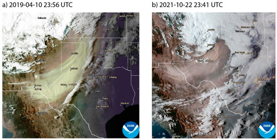 Two examples of recent dust events in Texas and the surrounding region on (a) 10 April 2019 at 23:56 UTC and (b) 22 October 2021 at 23:41 UTC, captured by the GOES-16 satellite and obtained from AerosolWatch (https://www.star.nesdis.noaa.gov/smcd/spb/aq/AerosolWatch/, accessed on 21 August 2022), showing dust transport from Mexico into Texas (a,b) and from Texas into Oklahoma and Kansas (a).