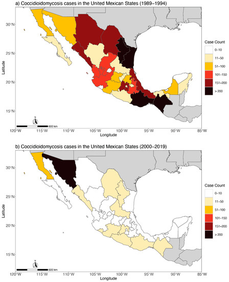 (a) Distribution of the 3691 human coccidioidomycosis cases in the United Mexican States from 1989 to 1994 and (b) 766 human coccidioidomycosis cases in the United Mexican States from 2000 to 2019.