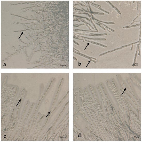 Microscopy was performed with the Keyence digital microscope on mycelium-grown Takashio agar plates [25,26]. A piece of agar medium, about 0.5–1 cm wide and 3–4 cm long, was taken from of the petri dish and covered with sterile cellophane foil before starting fungal cultivation to improve the contrast for microscopic images. Microscopic images were obtained directly from grown culture of the plates without damaging the mycelium.