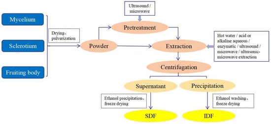 Using the extraction process shown in Figure 1, DFs from mushrooms are separated from the fruiting bodies, mycelia, or sclerotia [26,31]. As the first step of extraction, the dried mushroom fruiting bodies, mycelia, or sclerotia are ground into powder. The extraction is performed using ultrasonic or microwave treatment, or the powder is directly extracted with hot water, acid or alkaline aqueous solution, enzyme, ultrasonic waves, and other methods. Then, DFs are further isolated through centrifugation, ethanol precipitation, and freeze drying [40,41,42]. The type of extraction method affects the physicochemical properties and potential bioactivity of DFs; thus, the extraction method and extraction parameters, including solvent type, extraction temperature, extraction time, liquid–solid ratio, and equipment power, should be considered before DF extraction [43]. The methods for extracting DF from mushrooms include chemical, physical, enzyme, and microbial methods or a combination of these. Among them, alkali and enzymatic extraction methods are the most frequently used. The alkaline aqueous method is more widely used than the enzymatic method because it involves a simple protocol, has a low cost, and can be easily controlled [44,45]. The comparison of different methods and technical strategies used to extract DFs from mushrooms is shown in Table 1.