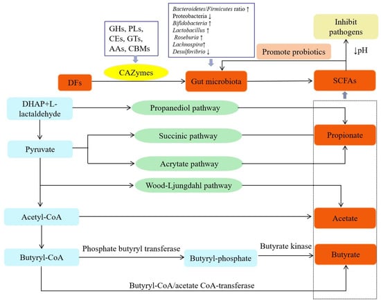 The fermentation of DF by the gut microbiota yields SCFAs such as acetate, propionate, and butyrate and gases such as CH4, H2, and CO2. As the energy source for colonic epithelial cells, SCFAs play a vital role in cell renewal and recovery. SCFAs can also affect the intestinal mucosal barrier and play a critical role in the health of the intestine [132]. Acetate is the most abundant intestinal SCFA. Intestinal anaerobic microorganisms produce acetate to metabolize pyruvate through acetyl coenzyme A or the Wood Ljungdahl pathway [133]. Propionate is formed by converting succinic acid into methylmalonyl coenzyme A through the succinic acid pathway [134]. Alternatively, propionic acid can be synthesized through the acrylate pathway using acrylic acid and lactic acid as precursors. Additionally, propionic acid can be synthesized through the propanediol pathway, with deoxyhexose (such as trehalose and rhamnose) used as the substrate [135]. Butyrate is reduced to butyryl coenzyme A after condensation with two acetyl coenzyme A molecules. Butyryl coenzyme A is then converted to butyric acid (classical way) through phosphate butyryl transferase and butyrate kinase [136] or through the butyryl coenzyme A/acetic acid coenzyme A transferase pathway [137,138].