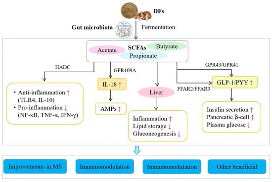 DFs improve host health after oral administration. Note: HADC: histone deacetylase; TLR4: toll-like receptor-4; IL-10: interleukin-10; NF-κB: nuclear factor-κB; TNF-α: tumor necrosis factor-α; IFN-γ: interferon-γ; GPR109A: G-protein-coupled receptor 109A; AMPs: antimicrobial peptides; FFAR2: free fatty acid receptor 2; GLP-1: glucagon-like peptide-1; PYY: peptide YY; MS: metabolic syndrome; ↑: increase; ↓: decrease.