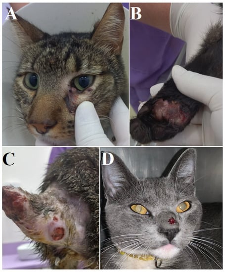In recent decades, the domestic cat (Felis catus) has played an important role in the epidemiology of sporotrichosis due to its increased susceptibility to this disease and its role as a vehicle of transmission to humans through bites, scratches, sneezing and contact with secretions from infected animals []. Sporotrichosis in cats is generally systemic, showing disseminated lesions with a high burden of infectious yeast-like cells and which, without treatment, cause death []. Infected animals show disseminated cutaneous lesions characterized by ulcers and nodules with exudate, especially on the face. Upon licking or touching with the extremities, the agent is transferred to the paws or the mouth, facilitating contagion. This behavior, together with the high burden of mycotic elements in the wounds, facilitates contagion among cats and other animals such as dogs and humans [].