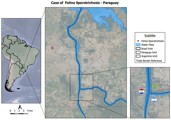 In Paraguay, the only reported CTS cases so far occurred in 2017 among relatives who moved from Brazil with an infected cat. Laboratory tests performed identified the etiological agent as Sporothrix spp. (without molecular identification). This was the first record of a travel-associated case of Sporothrix outside Brazil or Argentina, documenting the potential for spread to new areas through the transport of infected cats []. Other cases supporting CTS’s potential to spread were observed in the U.S. and U.K. In 2020, a Brazilian woman was diagnosed with CTS in Boston, U.S., after being bitten by a sick cat in Minas Gerais, Brazil []. More recently, researchers reported the first human and feline S. brasiliensis cases in the U.K., both involving people who had moved from Brazil []. In 2019, the World Health Organization published an international alert on the potential risk of transmission of infection by S. brasiliensis in neighboring countries []. Besides the spread of CTS in Brazil, sporotrichosis cases caused by S. brasiliensis have been observed in cats in other Latin American countries without previous exposure to Brazil [,]. In Argentina, for example, S. brasiliensis has already been described in cats from the provinces of Buenos Aires and Santa Cruz, located in the Argentinean Patagonian region. In Misiones, a province bordering Brazil, there was a single description of S. brasiliensis isolated from a human in 1986 []. In 2022, researchers from Chile described three cases of domestic and feral cats with S. brasiliensis in the Magallanes region of southern Chile. Those cases were the first isolation reports of S. brasiliensis in cats from Chile. Cases 1 and 2 came from the Río Verde County, a small rural village, and case 3 came from the city of Punta Arenas []. Here, we report the first autochthonous feline cases of CTS by S. brasiliensis in Paraguay (PY).