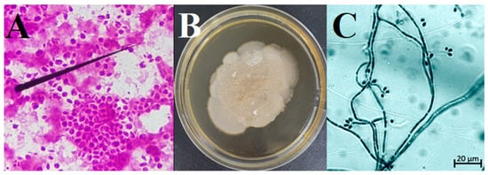 For both cases, swab samples of the lesions and slides with an imprint of the lesions were collected to perform the definitive diagnosis. Mycological examination of the slide samples was performed based on direct Gram-stain microscopy, which enabled visualizing cigar-shaped yeast structures in the feline samples (Figure 3A). Considering that culture is the gold standard for the diagnosis of sporotrichosis [], swabs collected from the wounds were placed in Stuart’s medium and sent to the laboratory for mycological cultures. The samples were cultivated on Sabouraud dextrose agar (SDA) (KASVI, ttps://www.kasvi.com.br, accessed on 9 June 2022) containing chloramphenicol and incubated at 25 °C for the growth of colonies for up to 10 days.