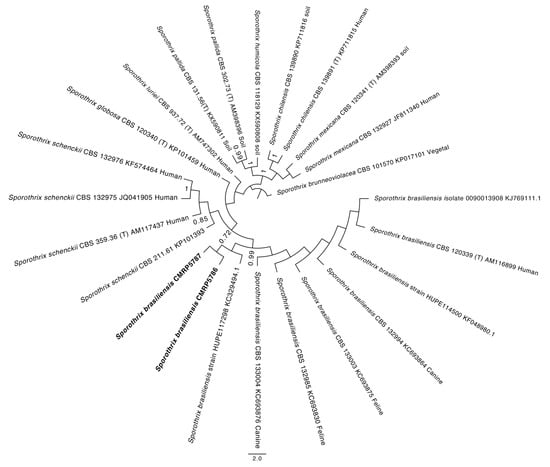 Molecular analysis of the two isolates was based on calmodulin (CAL) gene sequences. For molecular identification, colonies cultivated on Sabouraud glucose agar (SGA) were used for DNA extraction. The fungi mycelium was transferred to a 1.5 mL tube containing 100 mg of a silica celite mixture (2:1, w/w) and 300 µL CTAB buffer [CTAB 2% (w/v), NaCl 1.4 M, Tris-HCl 100 mM, pH 8.0; EDTA 20 mM]. Fungi cells were disrupted with a pestle for 5 min and incubated for 40 min at 65 °C. Then, 500 µL 24:1 chloroform: isoamyl alcohol (CIA) was added and the solution was centrifuged for 10 min at 20,500× g. The supernatant was collected in a new tube with 2 vols of ice-cold 96% ethanol. The DNA was precipitated for 2 h at −20 °C and then centrifuged for 10 min at 20,500× g, washed with cold 70% ethanol, dried at room temperature and resuspended in 100 µL in ultrapure water []. DNA integrity was assessed by running a 5 μL aliquot of the extraction on a 0.8% agar agarose-gel electrophoresis stained with 0.5 μg/ mL ethidium bromide. To estimate the DNA yield, we used a NanoDrop 1000c Instrument (Thermo Fisher Scientific, Waltham, MA, USA). Amplification of the CAL was performed using CL1 and CL2A primers []. PCR reaction mixtures were made with a total volume of 12.5 μL (1× PCR buffer, 2.0 mM MgCl2, 25 μM deoxynucleotide triphosphates (dNTPs)), 0.5 μM of each forward and reverse primer, 1 U of Taq DNA polymerase (Ludwig Biotec, Bela Vista, Brazil) and 10 ng of genomic DNA. The PCR parameters for amplification were 94 °C for 3 min, followed by 35 cycles consisting of 94 °C for 35 s, 58 °C for 30 s and 72 °C for 1 min, and a delay at 72 °C for 1 min, performed in an ABI Prism 2720 thermocycler (Applied Biosystems, Foster City, CA, USA). Amplicons were sequenced with BigDye Terminator cycle sequencing kit v. 3.1 (Applied Biosystems, Foster City, CA, USA) according to the manufacturer’s instructions, using the same primers of the PCR, and the amplification conditions were as follows: 95 °C for 1 min, followed by 30 cycles consisting of 95 °C for 10 s, 50 °C for 5 s and 60 °C. The consensus sequence of the CAL regions was visually inspected using MEGA v.7 software [] and compared to the GenBank Blast (NCBI). The sequences of CAL were aligned with reference strains (Table A1) using the online MUSCLE interface and the substitution model was selected for each genus using the MEGA software (GTR + G). The chosen index was the one that presented the lowest AIC. The phylogeny was constructed based on the CAL gene. Maximum likelihood analysis was performed in the RaxML-HPC2 [] implemented in the CIPRES server using the 1000 bootstrap to reach split frequencies of ≤0.01. The resulting trees were plotted in FigTree v.1.4.2 []. The results showed that the clinical strains were Sporothrix brasiliensis (Figure 4).