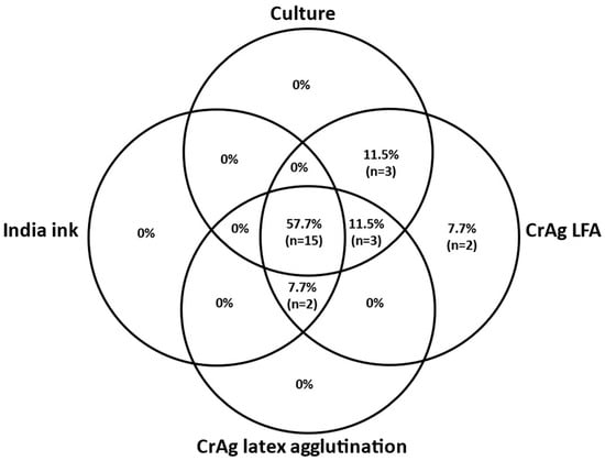 Venn diagram of distribution of 26 non-HIV individuals with cryptococcal meningitis tested with India ink, culture, cryptococcal antigen latex agglutination, and a cryptococcal antigen lateral flow assay in cerebrospinal fluid samples. Notes. CrAg: cryptococcal antigen; LFA: lateral flow assay.