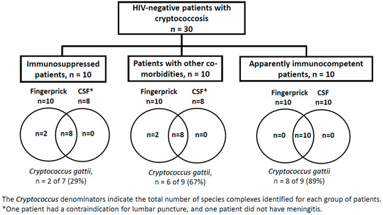 In conclusion, in this study, finger-prick whole blood CrAg LFA was an important and simple diagnostic tool demonstrating high sensitivity in the diagnosis of cryptococcosis in HIV-negative patients, including those with meningitis caused by C. gattii. Confirmatory validation studies are necessary, including critical aspects of the spectrum disease (e.g., cases with isolated pulmonary cryptococcosis) and other developed assays (e.g., CrAg quantitative and/or semi-quantitative LFA).