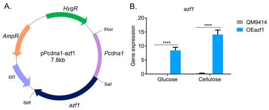 Overexpression of azf1 in T. reesei. (A) The vector pPcdna1-azf1, where azf1 is under the control of the constitutive promoter Pcdna1, and the hygromycin β phosphotransferase gene was used as the selection marker. (B) Gene expression of azf1 in the parental strain QM9414 and mutant strain OEAzf1 cultivated for 24 h in glucose and cellulose (pregrown in glycerol for 24 h). Asterisks indicate significant differences (**** p ≤ 0.0001) as assessed by one-way ANOVA followed by Bonferroni’s test.