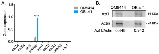 Overexpression of azf1 cannot activate cellulase expression in the presence of glucose. (A) Expression profile of genes involved in biomass degradation in the QM9414 and OEazf1 strains grown in glucose for 24 h assessed by RT-qPCR. Asterisks indicate significant differences (**** p ≤ 0.0001) as evaluated by one-way ANOVA followed by Bonferroni’s test. (B). Western blot to detect Azf1 in the intracellular extracts from QM9414 and OEazf1 strains grown in glucose for 24 h. An anti-actin antibody was used to normalize the amount of protein in the membrane. Densiometric analysis and quantification of the bands were performed with the ImageJ software (https://imagej.nih.gov/ij/index.html, accessed on 18 October 2020).