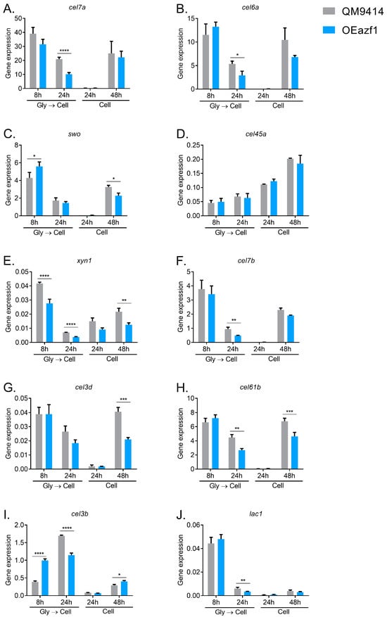 Overexpression of azf1 decreases the expression of cellulolytic genes in the presence of cellulose. (A–J) Expression profile of genes involved in biomass degradation in the QM9414 and OEazf1 strains assessed by RT-qPCR. Strains were grown in cellulose for 8 or 24 h after being grown in glycerol for 24 h (Gly → Cell) or directly grown in cellulose for 24 or 48 h (Cell). Asterisks indicate significant differences (* p ≤ 0.05, ** p ≤ 0.01, *** p ≤ 0.001, **** p ≤ 0.0001) as assessed by one-way ANOVA followed by Bonferroni’s test.
