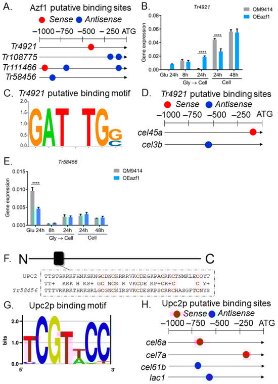 Regulatory network mediated by Azf1. (A) Putative Azf1-binding sites in the promoter of TFs differentially expressed in RNA-seq data. (B) Expression profile of Tr4921 in QM9414 and OEazf1 strains assessed by RT-qPCR. (C) The putative binding motif of Tr4921. (D) Putative binding sites of Tr4921 in the promoter of genes involved in biomass degradation analyzed by RT-qPCR. (E) Expression profile of Tr58456 in QM9414 and OEazf1 strains analyzed by RT-qPCR. (F) Alignment between the sequences of Tr58456 and its homologue in S. cerevisiae Upc2p in the DNA-binding domain (black box). Cysteine residues are highlighted in red. (G) Upc2p-binding motif. (H) Putative Upc2p-binding sites in the promoter of genes involved in biomass degradation analyzed by RT-qPCR. For gene expression analysis, strains were cultured in glucose for 24 h or in cellulose for 8 or 24 h after being grown in glycerol for 24 h (Gly → Cell) or directly in cellulose for 24 or 48 h (Cell). Asterisks indicate significant differences (**** p ≤ 0.0001) as determined by one-way ANOVA followed by Bonferroni’s test. Prediction of the putative binding motif for Tr4921 and Upc2p and their putative binding sites in the promoters was performed by bioinformatic analysis (see Section 2.8).