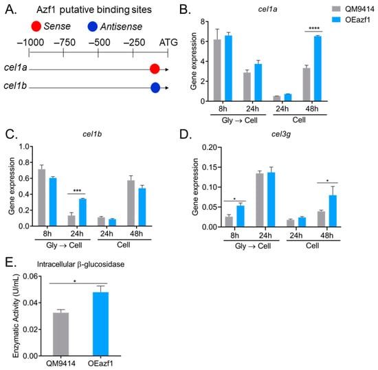 Overexpression of azf1 increases the production of intracellular β-glucosidases. (A) Azf1 putative binding sites in the promoter of cel1a and cel1b genes. (B–D) Expression profile of cel1a (B), cel1b (C), and cel3g (D) genes in QM9414 and OEazf1 strains assessed by RT-qPCR. Strains were grown in cellulose for 8 or 24 h after being grown in glycerol for 24 h (Gly → Cell) or directly grown in cellulose for 24 or 48 h (Cell). (E) β-glucosidase activity in the intracellular extracts from QM9414 and OEazf1 strains. Strains were grown in cellulose after being grown in glycerol for 24 h, and then 0.1 g of mycelium from each strain was used for protein extraction. Asterisks indicate significant differences (* p ≤ 0.05, *** p ≤ 0.001, **** p ≤ 0.0001) as assessed by one-way ANOVA followed by Bonferroni’s test.