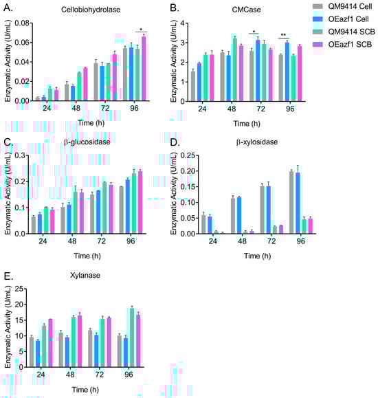 Overexpression of azf1 increases cellulase production in the long cultivation phase. Enzymatic activities of QM9414 and OEazf1 strains grown in cellulose (Cell) or sugarcane bagasse (SCB) after being grown in glycerol for 24 h. Supernatants were collected every 24 h for 96 h and used to measure cellobiohydrolase (A), CMCase (B), β-glucosidase (C), β-xylosidase (D), and xylanase (E). Asterisks indicate significant differences (* p ≤ 0.05, ** p ≤ 0.01) as assessed by one-way ANOVA followed by Bonferroni’s test.