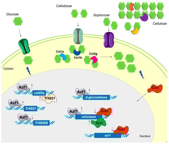 In the study by Pang and coworkers, cel1b overexpression did not increase the intracellular β-glucosidase activity [57], but when azf1 is overexpressed, this increase is observed. As such, in our hypothesis, when azf1 is overexpressed, the dose and synergism of Cel1a, Cel1b, Cel3g, and other β-glucosidases could be causing this early CCR. A hypothetical model of the regulatory mechanisms caused by the overexpression of azf1 in T. reesei is presented in Figure 9.