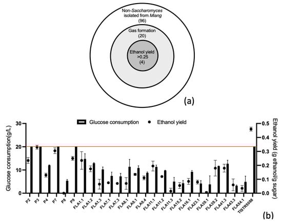 A total of 120 yeast strains used in this study and previously isolated from Miang samples by Kanpiengjai et al. [] were maintained in 25% (v/v) glycerol and kept at −80 °C as a stock culture at the Laboratory of Microbial Resources Development and Enzyme Technology, Faculty of Agro-Industry, Chiang Mai University. The reference strain S. cerevisiae TISTR 5088 was purchased from the culture collection of the Thailand Institute of Scientific and Technological Research (TISTR). The yeast strains were routinely grown at 30 °C in yeast peptone dextrose (YPD) broth consisting of 1% (w/v) yeast extract, 2% (w/v) peptone and 2% (w/v) glucose.