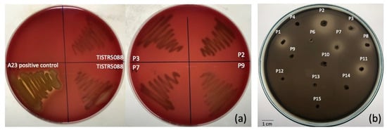 The tolerance to both a low pH condition and bile salts were used to evaluate the probiotic characteristics. The selected isolates showed a high tolerance to pepsin at pH 2.0 after 3 h exposure, with a survival rate of 83.9 to 99.9% (Table 1), whereas the survival rate of bile salt was 66.6 to 91.4%. The highest probiotic potential was in isolate P2, which demonstrated the highest percentage of survival rate, both in bile salt and low pH conditions, followed by isolates P3 and P9, respectively. However, the strains are required to survive against the natural barriers of the gastro-intestinal tract, including body temperature, a low pH in the stomach and high bile acid concentration at the duodenum in the small intestine []. The hydrophobicity of the yeasts was assessed indirectly as the ability to interact with chloroform and the results showed the hydrophobicity index ranged from 31.14 to 52.31%. None of the yeast strains showed β-hemolysis after 5 days incubation (Figure 2a). Several reports have previously described the probiotic properties of non-Saccharomyces yeast species in beverage and food production [,,,,]. This result shows the additional advantage to the potential health benefit using MF-broth. Although, C. rhodanensis were reported to be associated with clinical bovine mastitis [], but the C. rhodanensis strains investigated in this study are negative for a hemolytic response. In addition to the edible source of the yeast isolate, the negative hemolytic test indicates the safety status for C. rhodanensis used in this study [].