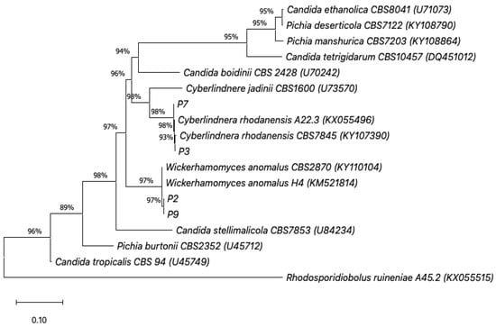 Phylogenetic tree analysis of the yeast Cyberlindera rhodanensis P3 and P7, Wikerhamomyces anomalus P2 and P9, based on particle 26S rDNA D1/D2 region sequence using the neighbor-joining method. Bootstrap values >50% (based on 1000 replication) are given at the branch points. The scale bar shows a patristic distance of 0.10.