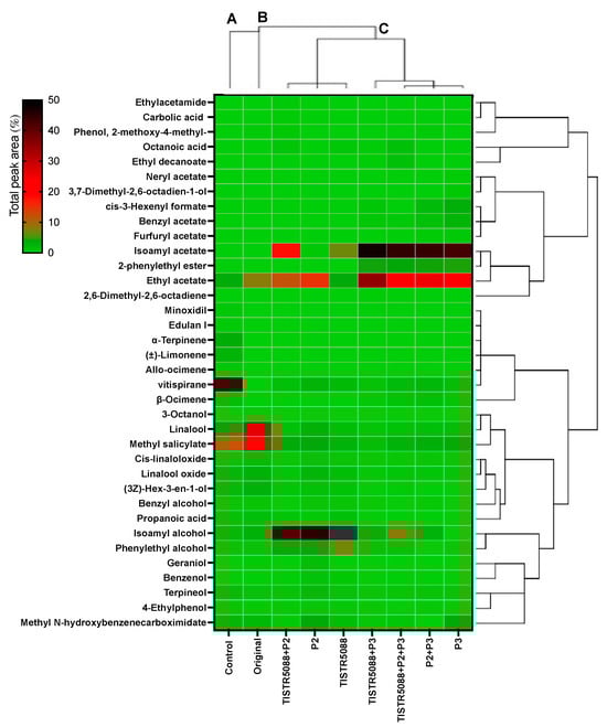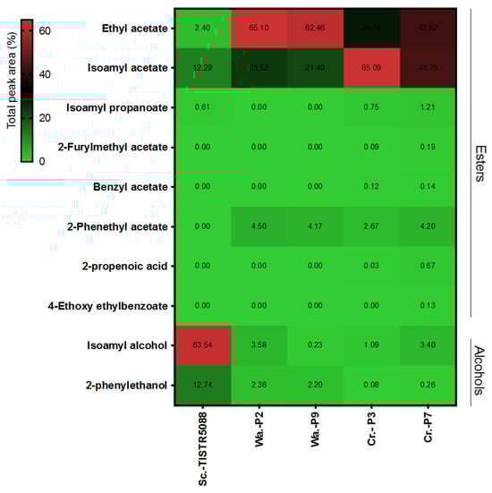 Heatmap using the total peak area (%) of VOCs produced with S. cerevisiae TISTR 5088, W. anomalus (P2, P9) and C. rhodanensis (P3, P7) on YM agar at 30 °C for 2 days.