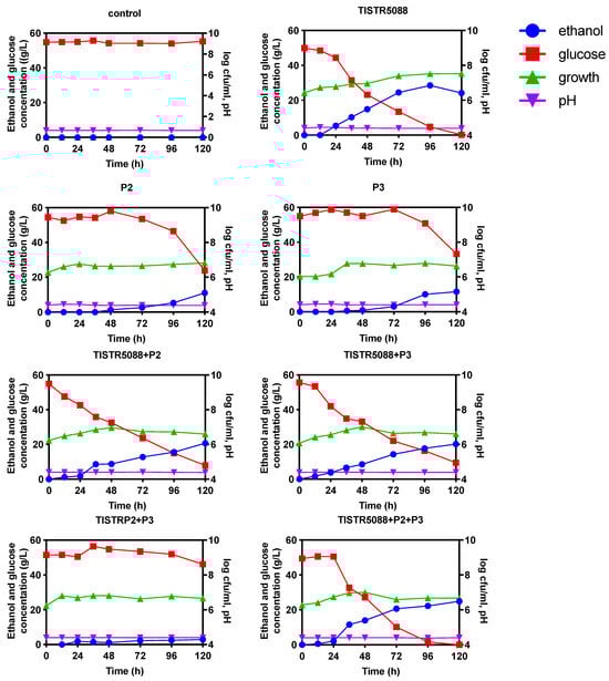 The growth dynamics of S. cerevisiae TISTR 5088 and non-Saccharomyces yeast species in the respective single fermentation (SF) and co-fermentation (CF) of MF-broth fermentation are shown in Figure 5. The control MF-broth did not have any microbial growth, while the culture of non-Saccharomyces species P2 and P3 showed the increase of the viable yeast number log 6.80 ± 0.03 and log 6.61 ± 0.03 CFU/mL, respectively. In CF, the growth of the yeast population showed a similar trend in all treatments and reached the approximate level of log 6.60 ± 0.02 CFU/mL at 120 h fermentation. The pH of MF-broth slightly decreased after 120 h of fermentation in the range of 4.04 ± 0.03 to 3.88 ± 0.01, which is very close to the pH of the initial MF-broth (Figure 5). The MF-broth fermentation inoculated with non-Saccharomyces yeast species exhibited a lower growth than that of S. cerevisiae TISTR 5088, which might be due to the numerous parameters involved, such as the cultivability loss of non-Saccharomyces strains in alcoholic fermentation, the nitrogen limitation, low oxygen availability and inhibition by increased ethanol, as well as extrinsic factors, such as SO2 [,]. However, when S. cerevisiae and non-Saccharomyces yeasts were inoculated in a 1:1 ratio, the amount of yeast was slightly reduced in SF, indicating a mutual inhibition under the current conditions, especially W. anomalus, which has a reported killer activity against S. cerevisiae. To minimize the technological issues caused by sluggish or incomplete alcoholic fermentation, the compatibility of the selected killer W. anomalus strains with the primary microbial agents involved in wine production must be investigated throughout the selection stage [,,].