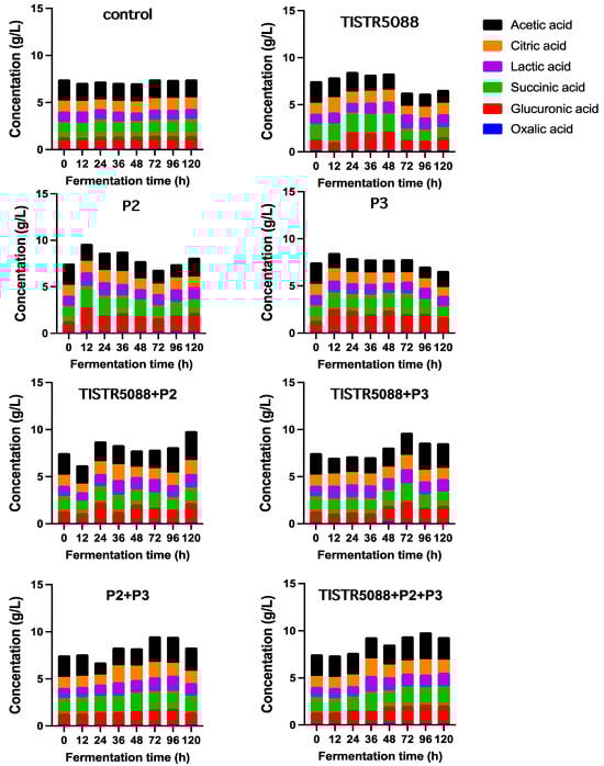Organic acid profiles during fermentation of MF-broth fermented by S. cerevisiae TISTR 5088, W. anomalus P2 and C. rhodanensis P3, with single and co-fermentation at 30 °C for 120 h.