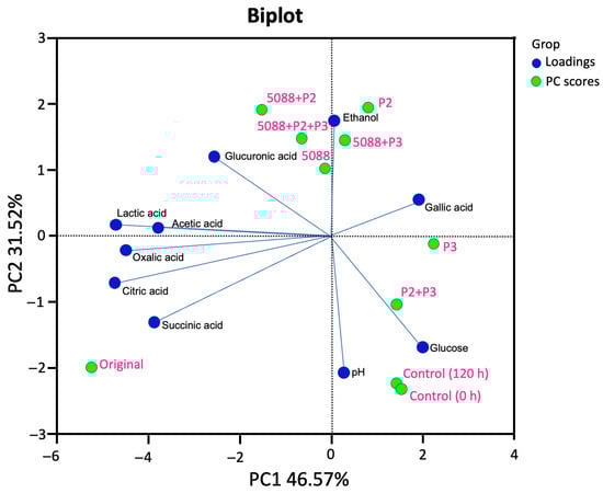 A PCA was used to analyze the results of products, in terms of glucose, ethanol and organic acids that remained after fermentation (Figure 7). The total variance was 78.09%, PC1 (46.57%) and PC2 (31.52%). Glucose, pH and gallic acids had been represented at PC1, whereas ethanol and organic acids were revealed at PC2. Regarding the relevance of the PC score, the PC1 projects the sample of the original MF-broth (0h), control, P3, and P2 + P3. PC2 was differentiated among samples of TISIR 5088, P2, TISIR 5088 + P2, TISIR 5088 + P3 and TISIR 5088 + P2 + P3. A clear separation of the fermented MF-broth obtained with the S. cerevisiae TISTR5088 was strongly related to ethanol production. In contrast, glucose concentration was observed in the unfermented sample of the initial MF-broth and the control at 120 h. The final important product, organic acids correlated with the original MF-broth that might come from what remains of the biotransformation during the FFP Miang fermentation, except gallic acid that was most associated with C. rhodanensis P3.