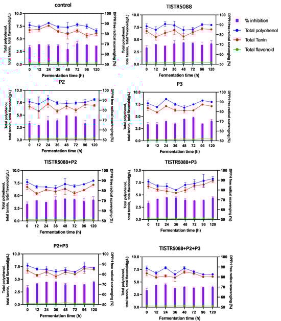Phenolic compounds, which are natural antioxidants, have markedly generated interest in Miang production due to their potential beneficial effects on humans [,,]. Interestingly, the MF-broth residual byproduct is similar to the extraction content of fermented leaves with water during the anaerobic fermentation, which causes the water-soluble phenolic compounds to be solubilized after release from the Miang leaves. Therefore, the fermented MF-broth byproduct was expected to have the same benefits as other types of fermented tea beverages as well. The overall perception of the experimental analysis with the yeast inoculation in fermentation revealed that TP, TT and TF were similar to the initial control. TP values ranged from 6.61 ± 0.28 to 8.27 ± 0.31 g/L, TT values ranged from 6.00 ± 0.02 to 7.91 ± 0.12 g/L and TF values ranged from 0.20 ± 0.03 to 0.36 ± 0.08 g/L (Figure 8). The antioxidant capacity of SF and CF were similar, where 10 µL of each sample exhibited DPPH scavenging abilities at a range of 68.93 ± 1.47% to 71.43 ± 1.7%, which showed no difference between the initial MF-broth and after 120 h fermentation. The bioactive molecules in the broth might be the result of biotransformation in the SMF process, in which microbes convert macronutrients, such as carbohydrates, proteins and lipids into bioactive compounds and dissolve them in aqueous solutions during fermentation []. This study added only glucose as a carbon source without other substrates for yeast to grow in and convert into ethanol. As a result, there may be insufficient precursors in MF-broth fermentation to be converted into the bioactive components. However, by comparing the bioactive compounds in the fermented Miang, it was found to be close to or higher than other fermented tea beverages. For example, in kombucha made from black, white and red teas, the TP content after 7 days of fermentation, was at 2.19 ± 0.21, 2.05 ± 0.30, and 2.70 ± 0.40 g/L, respectively, whereas the DPPH scavenging ability was 70.63 ± 0.53%, 79.13 ± 0.93% and 77.37 ± 0.80% []. It is expected that by using the benefits of tea containing catechins, gallic acid and other antioxidative compounds, the fermented MF-broth could be developed into a health-targeted beverage, similar to other tea wines, such as Oolong tea and pear wine [].