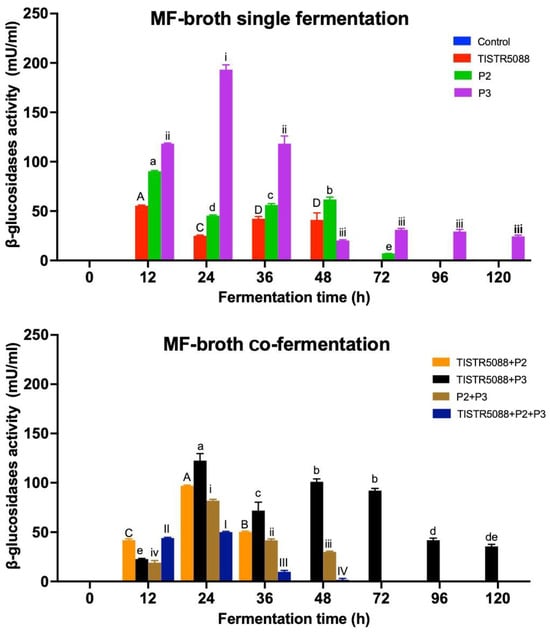 Changes of β-Glucosidase activity in MF-broth were observed and it was found that the increase in enzyme activity was observed in all fermentation broths, except the non-inoculated treatment (control). The SF fermented MF-broth with S. cerevisiae TISTR 5088 produced β-glucosidase at 24.51 ± 1.42 to 46.09 ± 1.73 mU/mL, whereas non-Saccharomyces W. anomalus P2 and C. rhodanensis P3 produced β-glucosidase in the range of 63.47 ± 5.12 to 89.86 ± 5.31 mU/mL and 20.78 ± 1.42 to 196.68 ± 3.55 mU/mL, respectively. C. rhodanensis P3 showed the highest β-glucosidase activity of 196.68 ± 3.55 mU/mL at 24 h fermentation. In the case of the CF fermentation, all treatments showed the activity of β-glucosidase at 12 h to 48 h except TISTR 5088 + P3, which was continuous to 120 h (Figure 9). TISTR 5088 + P3 showed the highest activity of 127.56 ± 1.24 mU/mL at 24 h fermentation and this ranged from 23.35 ± 4.09 to 127.56 ± 1.24 mU/mL, followed by TISTR 5088 + P2 (40.84 ± 0.89 to 97.40 ± 4.44 mU/mL), P2 + P3 (17.59 ± 2.67 to 82.94 ± 1.78 mU/mL) and TISTR 5088 + P2 + P3 (1.63 ± 0.31 to 49.64 ± 1.71 mU/mL), respectively. However, the decrease of β-glucosidase levels after 24 h was observed (Figure 5). This might be due to an increase in ethanol levels and high acid, as the previous research found that high acidity, high glucose and high ethanol concentrations affected the function of this enzyme []. However, MF-broth fermentation with C. rhodanensis P3 showed remarkable enzyme activities in both SF and CF fermentations, in which the functional activity of β-glucosidase is hydrolyzing the glycosidic bonds from various aglycone structures into monoterpenes, which are precursors of aromatic compounds [,]. Consequently, previous research investigated the use of β-glucosidase produced from Cyberlindnera to develop an aroma in fermented beverages and tea [,,,]. Wang et al. [] found that C. saturuns var. mrakii NCYC 2251 β-glycosides enhanced the tea aroma in green tea slurry by hydrolyzing glycoside precursors (β-glucosides and β-primeverosides) such as geranyl, linalyl, benzyl and 2-phenylethyl glucosides. Furthermore, the benefits of β-glycosides in improving the beverage flavor were also revealed in the W. anomalus species, and certain strains were reported to have β-glycosidase, that is multi-functionally active under common oenological conditions. Thus, the enzyme might have multiple applications in fermentation, such as enhancing the sensory and bioactive component concentrations by splitting the glycosylated precursors [,]. Due to the reasons mentioned above, β-glucosidase from both non-Saccharomyces strains used in this experiment possibly plays an important role in odor and aroma formation, leading to the formation of special quality characteristics in fermented MF-broth byproducts, which requires further research.