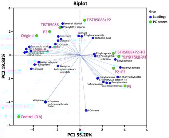PCA biplot of the volatile compounds in the original and fermented MF-broth by S. cerevisiae TISTR 5088, W. anomalus P2 and C. rhodanensis P3, with single and co-fermentation at 120 h.