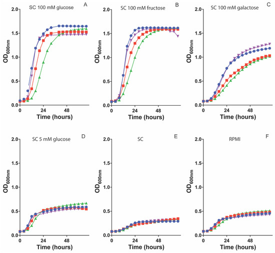 Strains were grown overnight in YP glucose (100 mM). Cells were collected and washed twice with sterile Milli-Q water. Samples were diluted to OD600 0.1 in sterile Milli-Q water. Then, 20 µL of the cell suspension was added to 180 µL of SC medium supplemented with the indicated carbon source or RMPI medium in a sterile 96-well plate. The OD600 was measured every half hour for 72 h in a Multiskan (Thermo Fisher, Waltham, MA, USA). Data analysis was performed in Graphpad Prism by using an ANOVA test with Bonferroni correction.