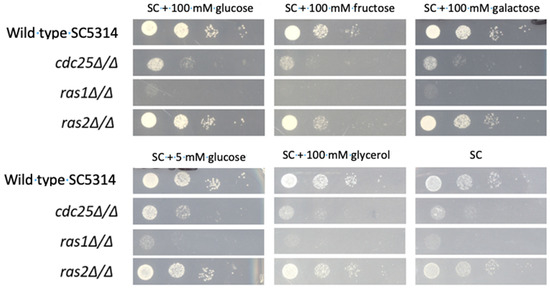 Both Cdc25 and Ras1 are important for a normal growth rate on all tested carbon sources. Deletion of CDC25 results in a significant decreased growth compared to the WT (except for 100 mM fructose), and a ras1 mutant shows an even more significant affected growth. However, a growth defect of the cdc25 and ras1 mutant on 5 mM glucose and RPMI is absent compared to higher sugar concentrations. This can be explained by the fact that cells generally grow slower at these low sugar concentrations. Therefore, the growth defect is not clearly pronounced, and it is harder to distinguish the growth of the mutant compared to the growth of the WT strain. Since the growth defect is observed in both a cdc25 and ras1 mutant, this defect can be caused by inactivation of the PKA pathway. The difference between the growth rate of these two mutants can be explained by the fact that Cdc25 activates Ras1, but basal activated Ras1 levels are also present without activation by Cdc25. We also see a significant growth defect of the cdc25 and ras1 mutant on carbon sources such as fructose, galactose, and glycerol during growth on solid medium [1,2,4]. These results are unexpected as these three carbon sources do not activate PKA. Therefore, we did not expect an effect of a CDC25 or RAS1 deletion on the growth on fructose, galactose, and glycerol as we assign the growth defect of these two mutant strain to inactivation of the PKA pathway. However, we also show that the cdc25 and ras1 mutant have a different growth pattern compared to the WT on solid SC medium without a carbon source. This indicates that the growth defect of the cdc25 and ras1 mutant is not caused by inactivation of PKA due to these deletions otherwise we would only observe a growth defect on carbon sources that are able to activate PKA. It is possible that these two proteins influence cell growth independently of PKA and thus we see this growth defect during all tested conditions.