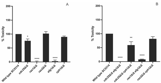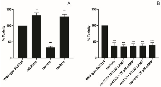 3.4. Cdc25 and Ras1 Are Involved in Toxicity towards Oral Epithelial Cells