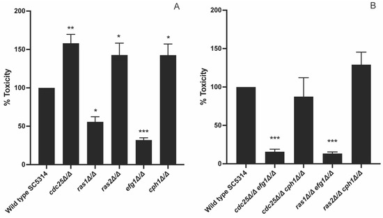 As we obtained these peculiar results, we wanted to further investigate which mechanism is important during infection of HeLa cells. Hence, we investigated the role of two downstream pathways of Ras, namely the PKA pathway and the MAPK pathway. The MAPK pathway is important for sensing and responding to specific environmental conditions, like serum, cell wall damage or osmotic stress. Different routes of the MAPK pathway are described for C. albicans, such as the Cek1/Cph1 route [30]. We investigated the role of the PKA and MAPK pathway by making use of an efg1 mutant and a cph1 mutant. EFG1 and CPH1 encode transcription factors activated by PKA and MAPK, respectively. This would allow us to see the role of these two transcription factors downstream of their specific pathway during virulence towards HeLa cells. We observed that an efg1 mutant showed a decreased toxicity while a cph1 mutant had an increased toxicity towards HeLa cells (Figure 4A). In a next step, we also investigated the effect on HeLa toxicity of different double deletion strains: cdc25 efg1, cdc25 cph1, ras1 efg1, and ras2 cph1. We showed that both the cdc25 efg1 and ras1 efg1 mutant had a significant reduced toxicity compared to the WT, while both cdc25 cph1 and ras2 cph1 showed no difference in toxicity (Figure 4B).
