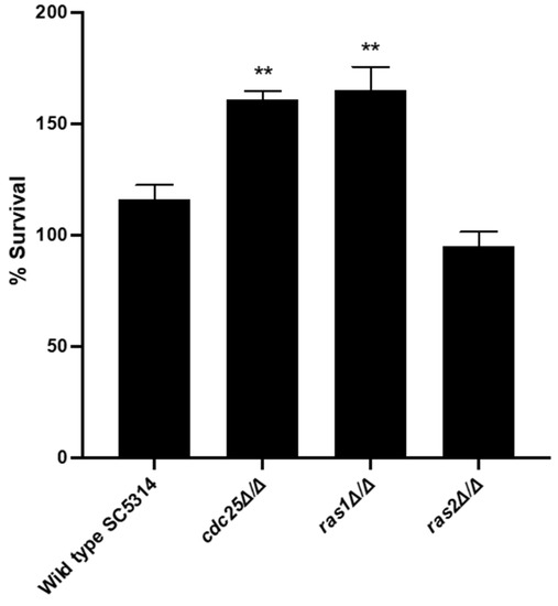 3.5. Deletion of CDC25 or RAS1 Results in a Higher Survival of C. albicans in the Presence of Macrophages