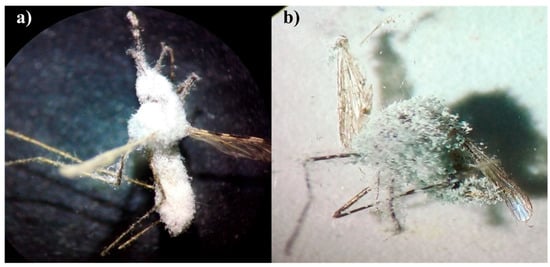 An. stephensi adult mosquitoes exposed to the EPF-treated panels indicating mycosis. (a) An. stephensi exposed to B. Bassiana, (b) An. stephensi exposed to M. anisopliae.