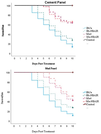 Survival rate of An. stephensi exposed to B. bassiana- and M. anisopliae-treated cement and mud panels through WHO cone bioassay tests.