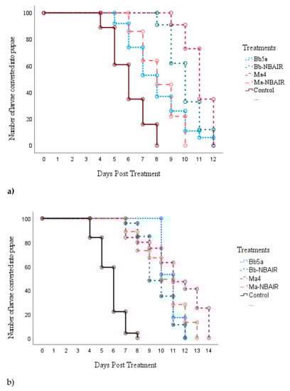 Time required for larvae of An. stephensi to undergo stage change to pupae when exposed to fungal conidia and blastospores. Fungal conidia (a) and blastospores (b).