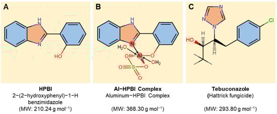 Chemical structure of tested compounds. (A) 2-(2-Hydroxyphenyl)-1H-benzimidazole (HPBI), (B) aluminum-HPBI complex (Al-HPBI complex), and (C) Tebuconazole (Hattrick fungicide). Molecular weight/molar mass (g·mol−1) is presented under each compound.