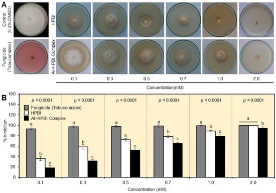 In vitro antifungal activity of HPBI and its aluminum complex against Fusarium equiseti. (A) Antifungal activity of HPBI and its aluminum complex against F. equiseti. (B) Inhibition (%) of mycelial growth of F. equiseti growing on PDA medium containing HPBI or its aluminum complex. Bars represent the means ± standard deviation (means ± SD) of six biological replicates (n = 6). Different letters signify statistically significant differences between treatments (p < 0.05). The experiment was repeated twice with similar results.