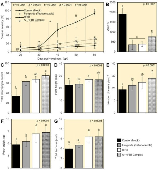 The disease severity was assessed at 20-, 30-, 40-, 50-, and 60-days post-treatment (dpt) according to the scale suggested by Song et al. [28], and the area under the disease–progress curve (AUDPC) was calculated, as described by Jeger et al. [29]. Furthermore, total chlorophyll (SPAD), plant height (cm), the number of leaves per plant, fresh weight (g plant−1), and total leaf area (cm2) were assessed as growth indicators at 60 dpt.